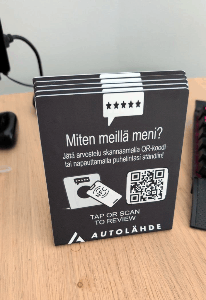 Asiakkaiden näkyville asetettava ständi, joka puhelinta näpäyttämällä ohjaa arvostelemaan yritystäsi.